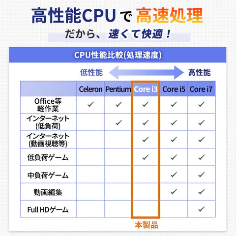 - 第8世代Core i3を搭載した薄型ワイドディスプレイノートパソコンです。普段使いではストレスを感じることなくお使いただけるコストパフォーマンスに優れた商品です。
